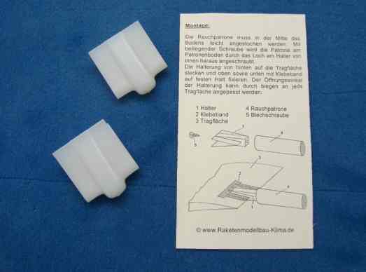 Um an Modellflugzeugen an den Tragflächenenden die Rauchpatronen sicher zu befestigen, haben wir spezielle, immer wieder verwendbare Halterungen entwickelt. Die Halterungen können an alle Tragflächen ohne das Modell zu beschädigen nur mit Klebeband angebracht und jederzeit wieder entfernt werden. Sie bieten einen sicheren Halt der Patrone und Schutz des Modells auch bei höheren Geschwindigkeiten. Zum Patronenwechsel wird diese einfach nur auf die Halterung gedreht.